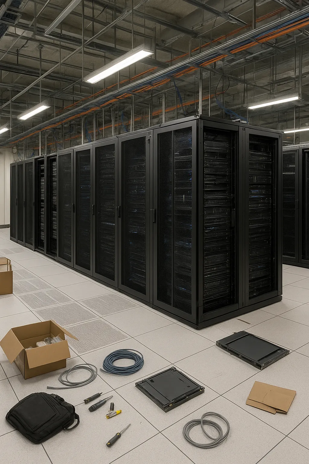 Montado de Racks, abiertos y cerrados así como gabinetes con puerta de cristal para protección y aislamiento de equipos de comunicación y datos.